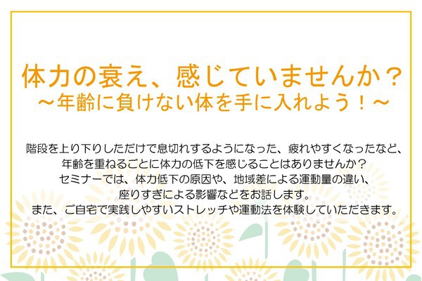 ウォーキング、生活習慣病予防セミナーなど、健康をテーマにしたイベントに参加してあなたの健康づくりにお役立てください。